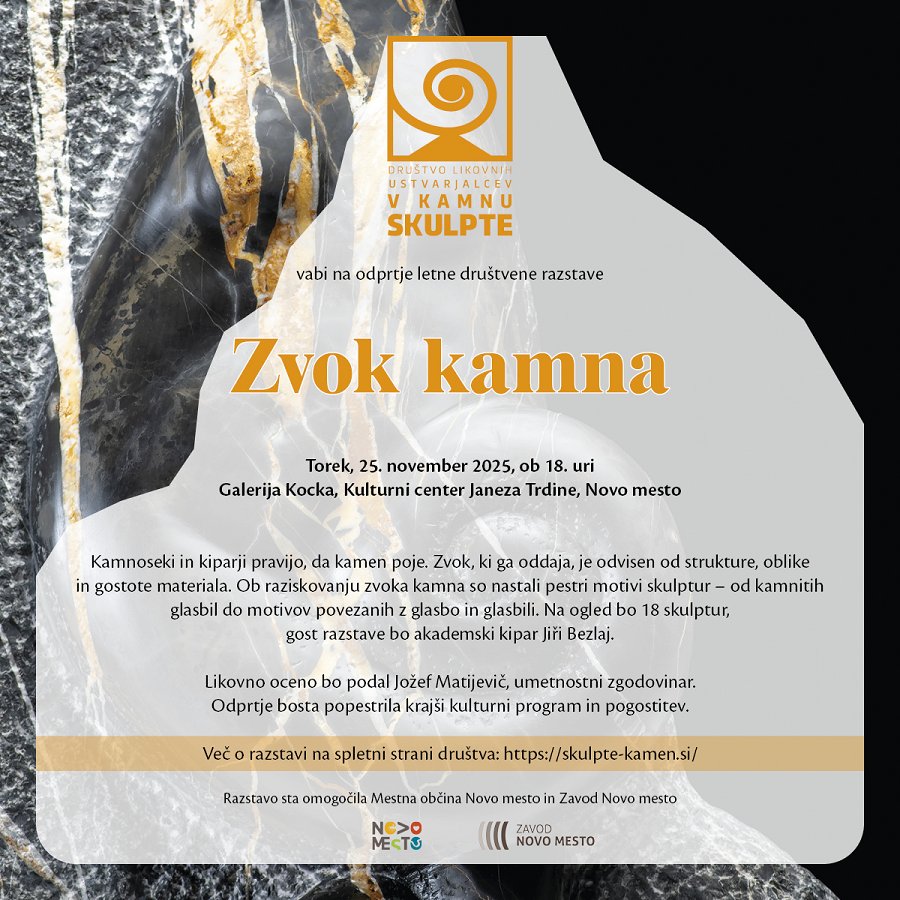 Člani društva likovnih ustvarjalcev v kamnu Skulpte Vas prav lepo vabijo na otvoritev letne razstave v torek, 25. novembra ob 18 uri v galerijo Kocka v KC Janeza Trdine. Letos so v kamnu ustvarjali na temo Zvok kamna, ob tem pa so nastali pestri motivi skulptur - od kamnitih glasbil do motivov povezanih z glasbo ter glasbili z gostom Jirijem Bezlajem. Za otvoritev pa so pripravili tudi zanimiv kulturni program. Čaka vas tudi pogostitev.