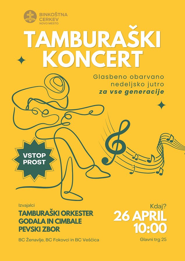 Binkoštna cerkev Novo mesto organizira tamburaški koncert - glasbeno obarvano nedeljsko jutro za vse generacije, na katerem bodo nastopili tamburaški orkester, godala in cimbale ter pevski zbor. Dogodek bo potekal v nedeljo, 26. aprila ob 10.00 na Glavnem trgu 25. Vstop je prost.