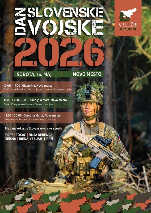 • osrednja vojaška slovesnost s koncertom Orkestra Slovenske vojske z gosti bo v dvorani Marof ob 18. uri. Big band Orkestra Slovenske vojske bo oder delil z znanimi glasbenimi imeni: MRFY, Tokacem, Ireno Yebuah Tiran, Nušo Derenda in Neisho. Vstopnice za slovesnost in koncert bodo 21. aprila na voljo na spletni strani Eventim: