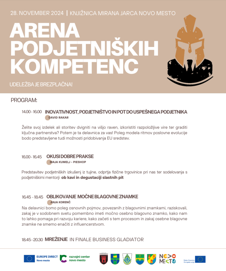 V četrtek, 28. novembra 2024, ob 14. uri bo v Knjižnici Mirana Jarca Novo mesto brezplačen dogodek Arena podjetniških kompetenc, s katerim boste nadgradili vaše znanje in razvili nove spretnosti. Dogodek bo združil vrhunske strokovnjake na področju podjetništva, marketinga in oblikovanja blagovne znamke ter se osredotočal na inovativno, uspešno in trajnostno prihodnost v podjetništvu.