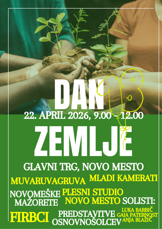 V sredo, 22. aprila 2026, bomo v Novem mestu ponovno obeležili Dan zemlje. Med 9. in 12. uro vabimo vse generacije na Glavni trg, kjer bomo skozi ustvarjalne, poučne in interaktivne vsebine krepili zavedanje o varovanju okolja.